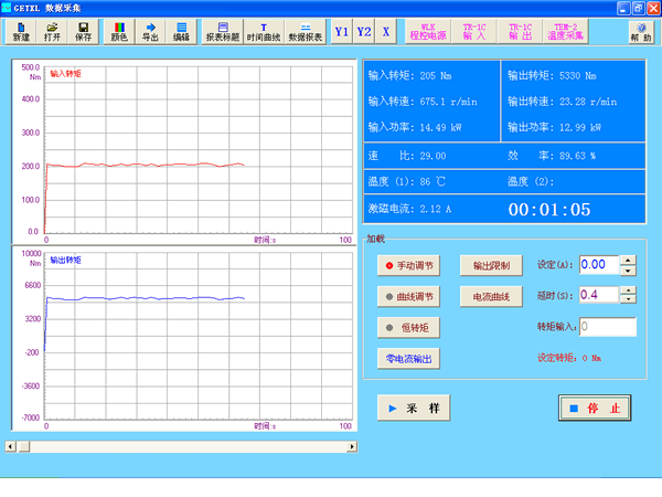 - 所有儀器通過RS485總線與電腦連接,實現(xiàn)對變速箱的自動加載以及對數(shù)據(jù)的集中采集。實時顯示各參數(shù)與時間之間的關系曲線,以記錄整過測試過程。