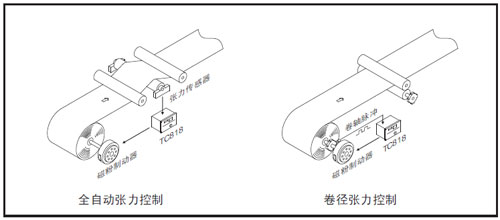 TC818可以設(shè)置為全自動(dòng)張力控制器或卷徑張力控制器,當(dāng)功能選擇[29][1]設(shè)置為自動(dòng)張力控制時(shí),TC818為全自動(dòng)張力拉制器,需安裝張力傳感器,組成閉環(huán)控制系統(tǒng)。當(dāng)功能選擇[29]設(shè)置為卷徑張力控制時(shí),TC818為卷徑張力控制器,只需安裝接近開關(guān)/編碼器對(duì)料卷半徑進(jìn)行測(cè)量,控制器根據(jù)卷徑張力控制。