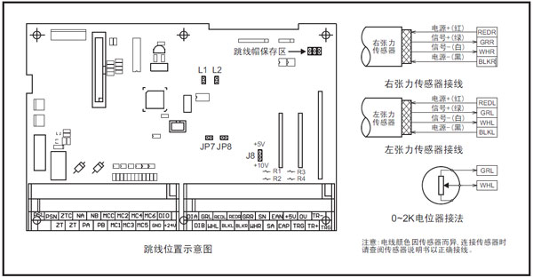 [3]在浮輥式張力系統(tǒng)中,當(dāng)選用的角度傳感器為0~2KΩ點(diǎn)位器時(shí),請(qǐng)將控制板上的跳線L1短接(為點(diǎn)位器提供恒流源),JP7,JP8短接。