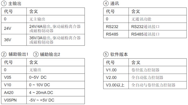 (2) TC818-24V/V05V05V0-V4.00表示主輸出為24V/4A,輔助輸出1和輔助輸出2為0~5V,軟件版本號(hào)為V4.00的張力控制器。