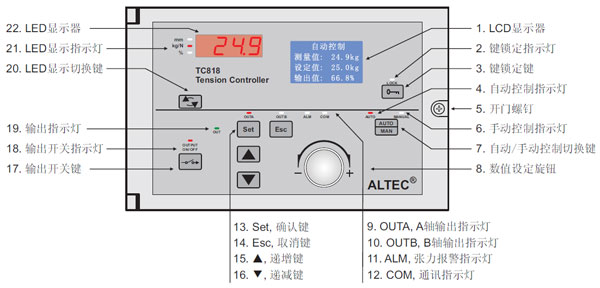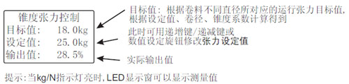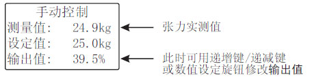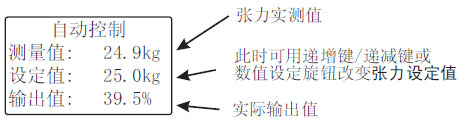 當(dāng)控制器工作在自動(dòng)控制模式時(shí),自動(dòng)控制指示燈(AUTO)點(diǎn)亮,可旋轉(zhuǎn)數(shù)值設(shè)定旋鈕或按遞增鍵/遞減鍵修改張力設(shè)定值,按AUTO/MAN鍵可切換到手動(dòng)控制模式。