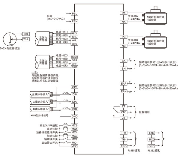 4 | PB, NB | 輸出 | 輸出24V/4A 或 36V/3A | 接B軸磁粉離合器或磁粉制動(dòng)器 |