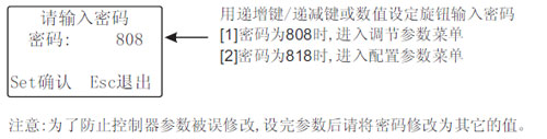 當(dāng)控制器處于“自動(dòng)控制”或“手動(dòng)控制”顯示界面時(shí),此鍵用于鎖定(防止誤操作)或解鎖,鍵鎖定后將使遞增鍵 、遞減鍵、Set/Esc鍵、自動(dòng)/手動(dòng)切換鍵、輸出開關(guān)鍵和數(shù)值設(shè)定旋鈕失效。